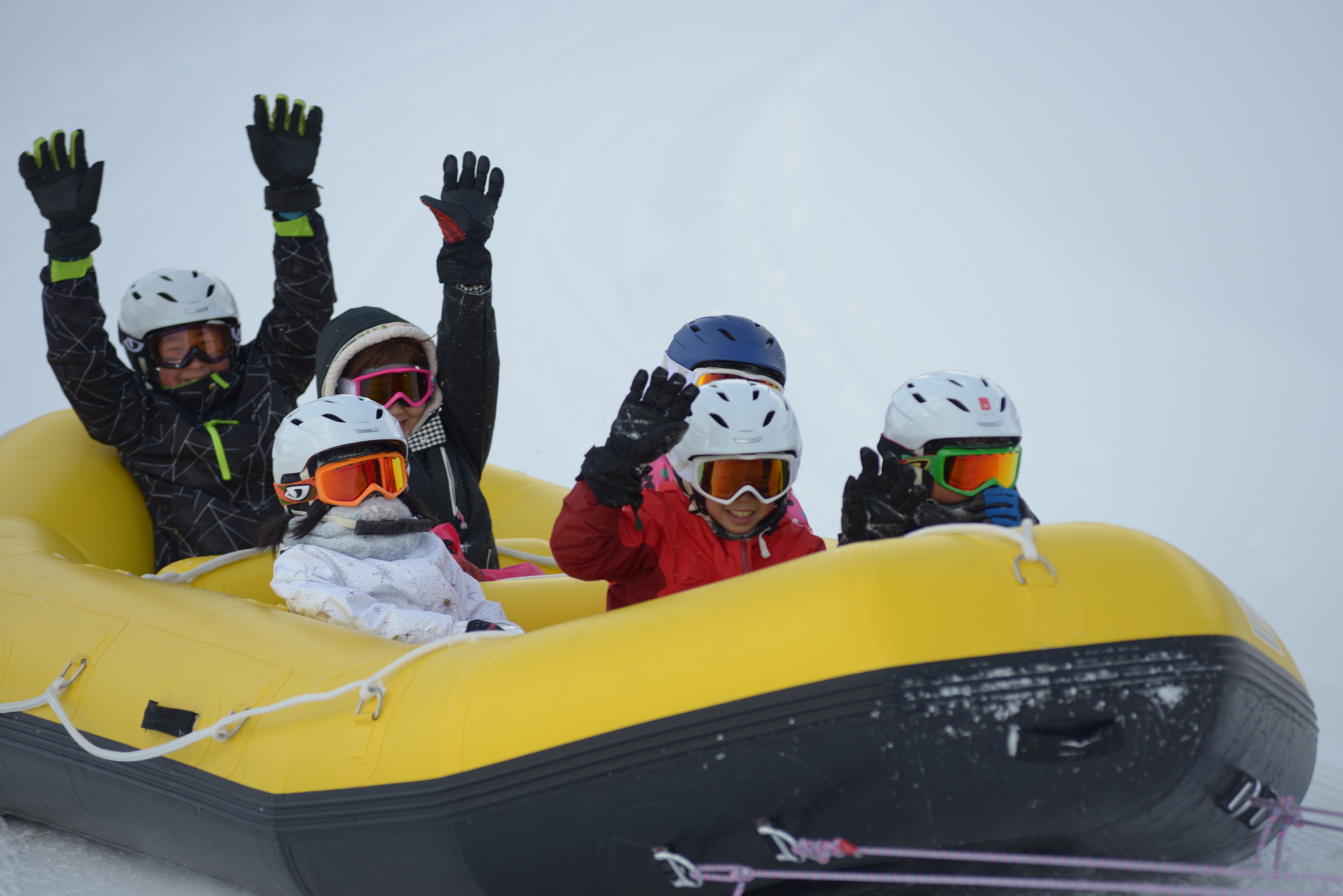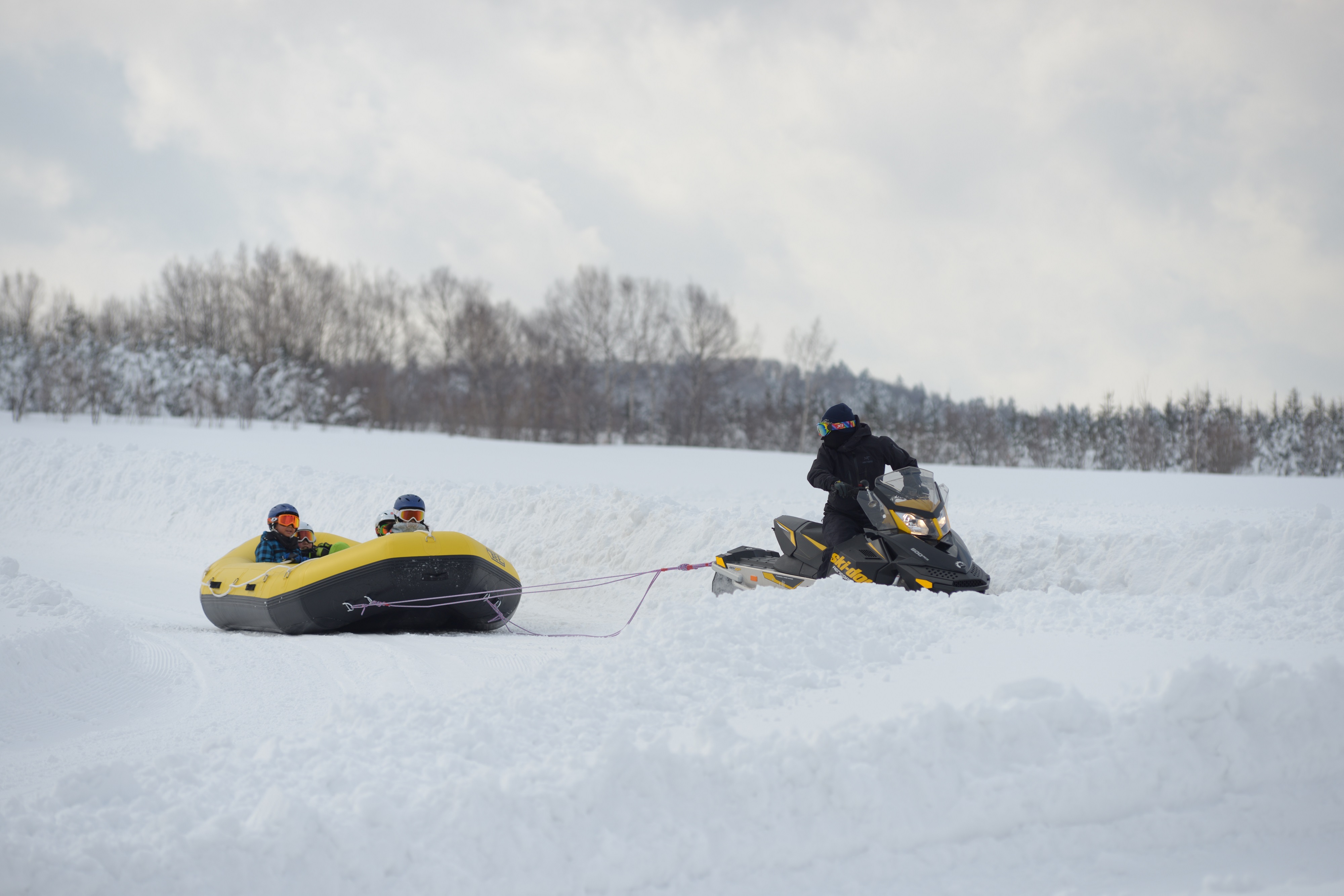 スノーモービルで引っ張るラフトボードに乗って、パウダースノーの中へ。旭ヶ丘ならではの、このフワフワ雪だからこそ味わえる爽快感。雪けむりの舞うスピードは迫力満点です。