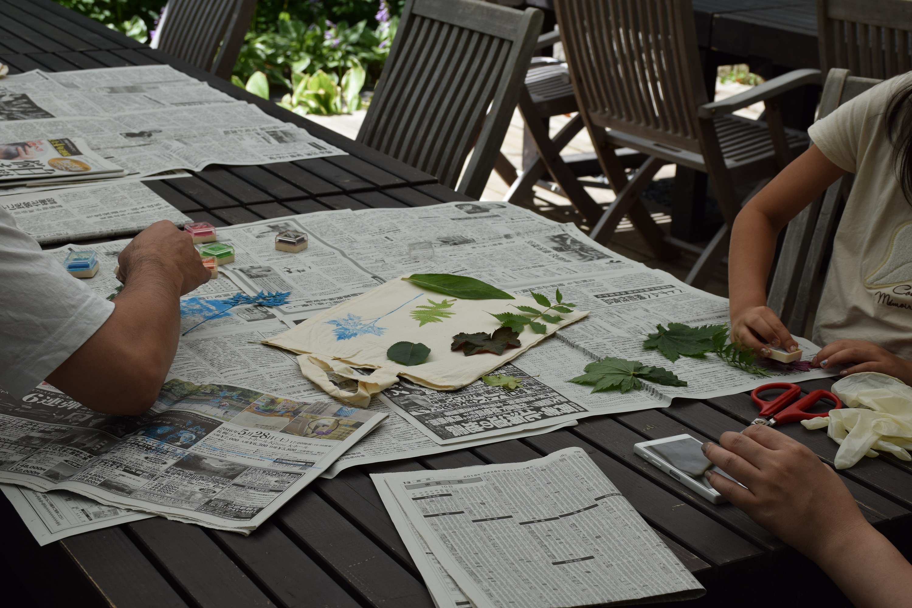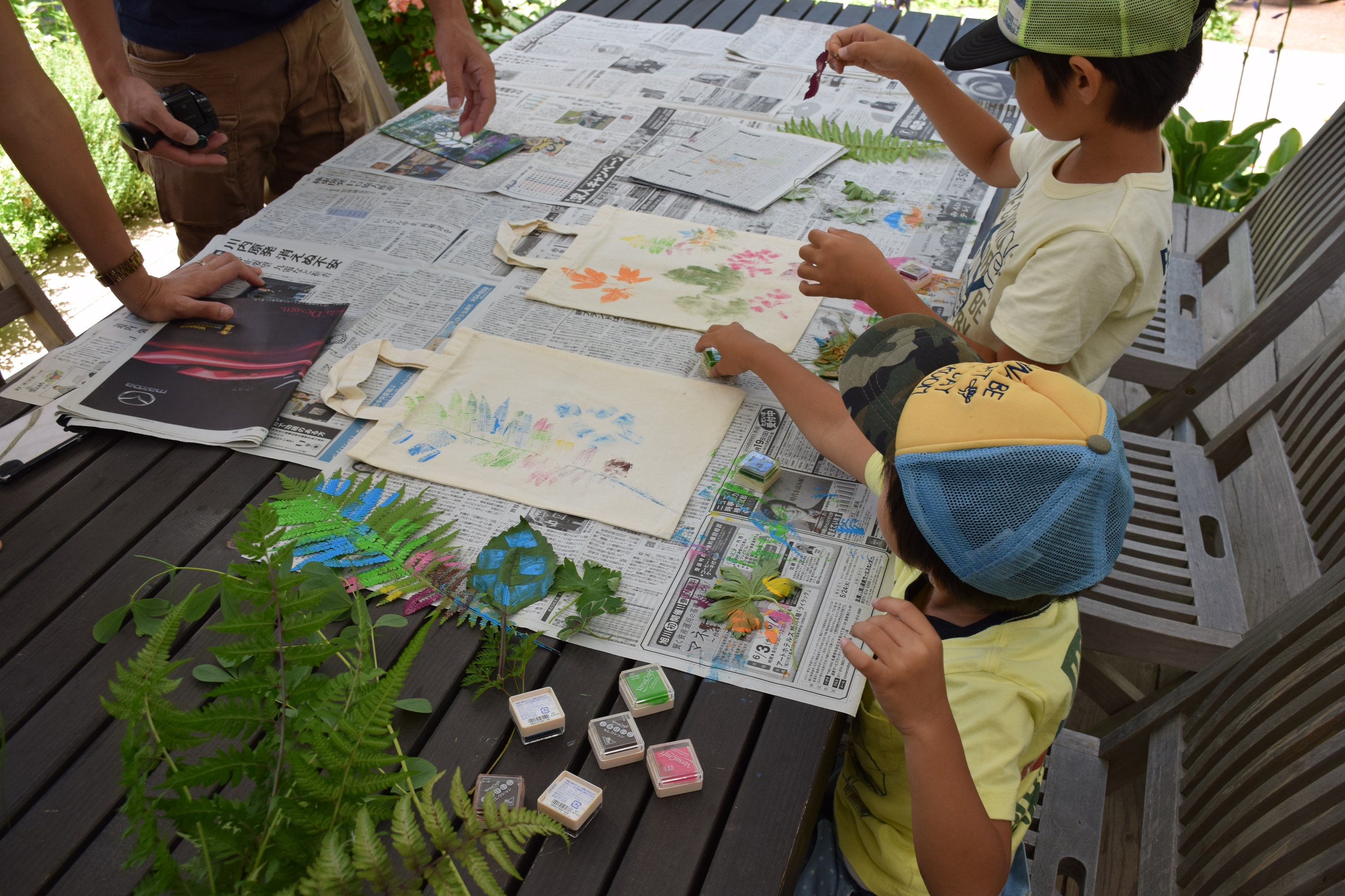 ガーデン内の植物の葉っぱにいろんな色のインクをつけて、無地のエコバッグにペタっと押していきます。