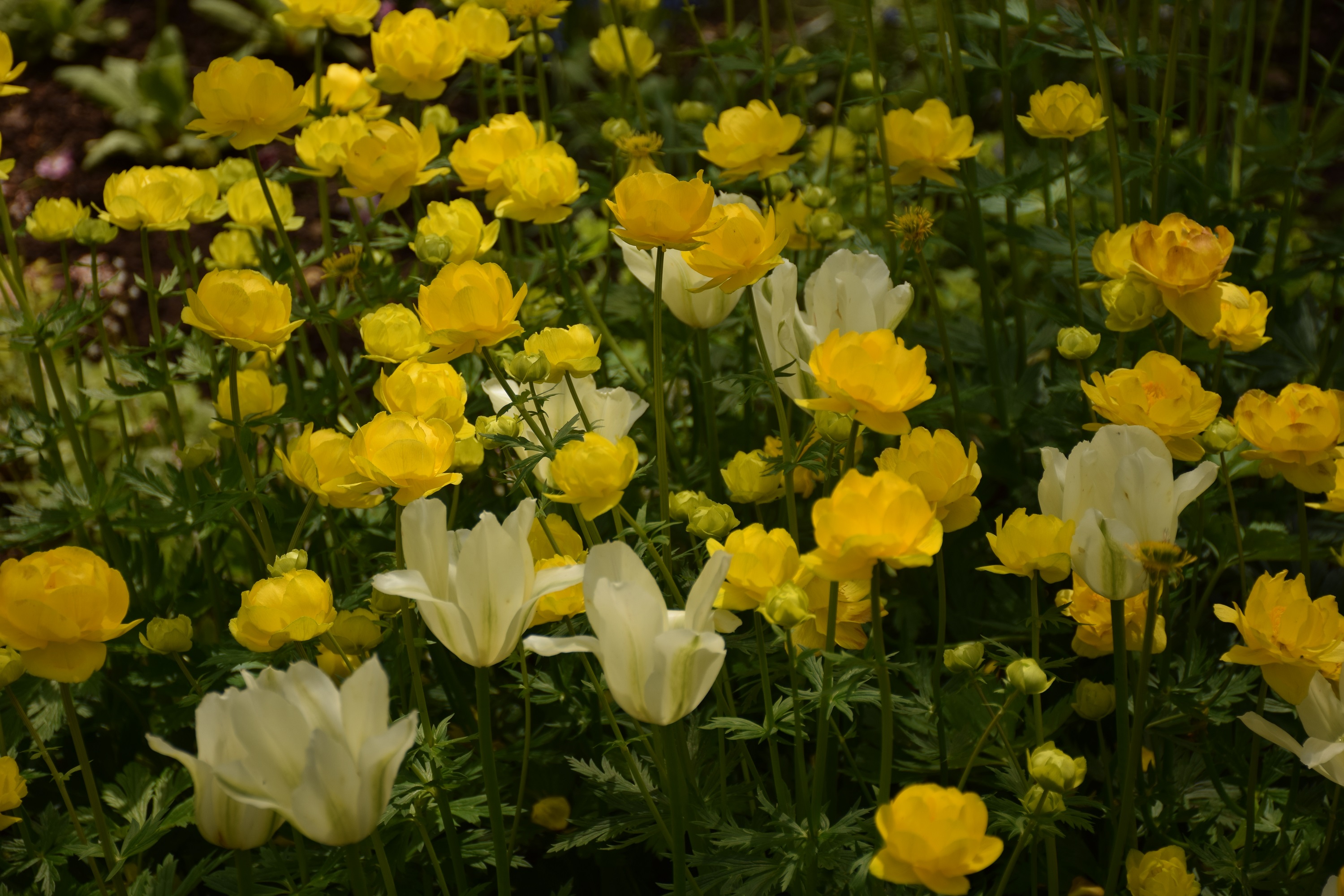 春のすみかでは、黄色のトロリウスも目を惹きます。白のチューリップとの組み合わせもいいですね。