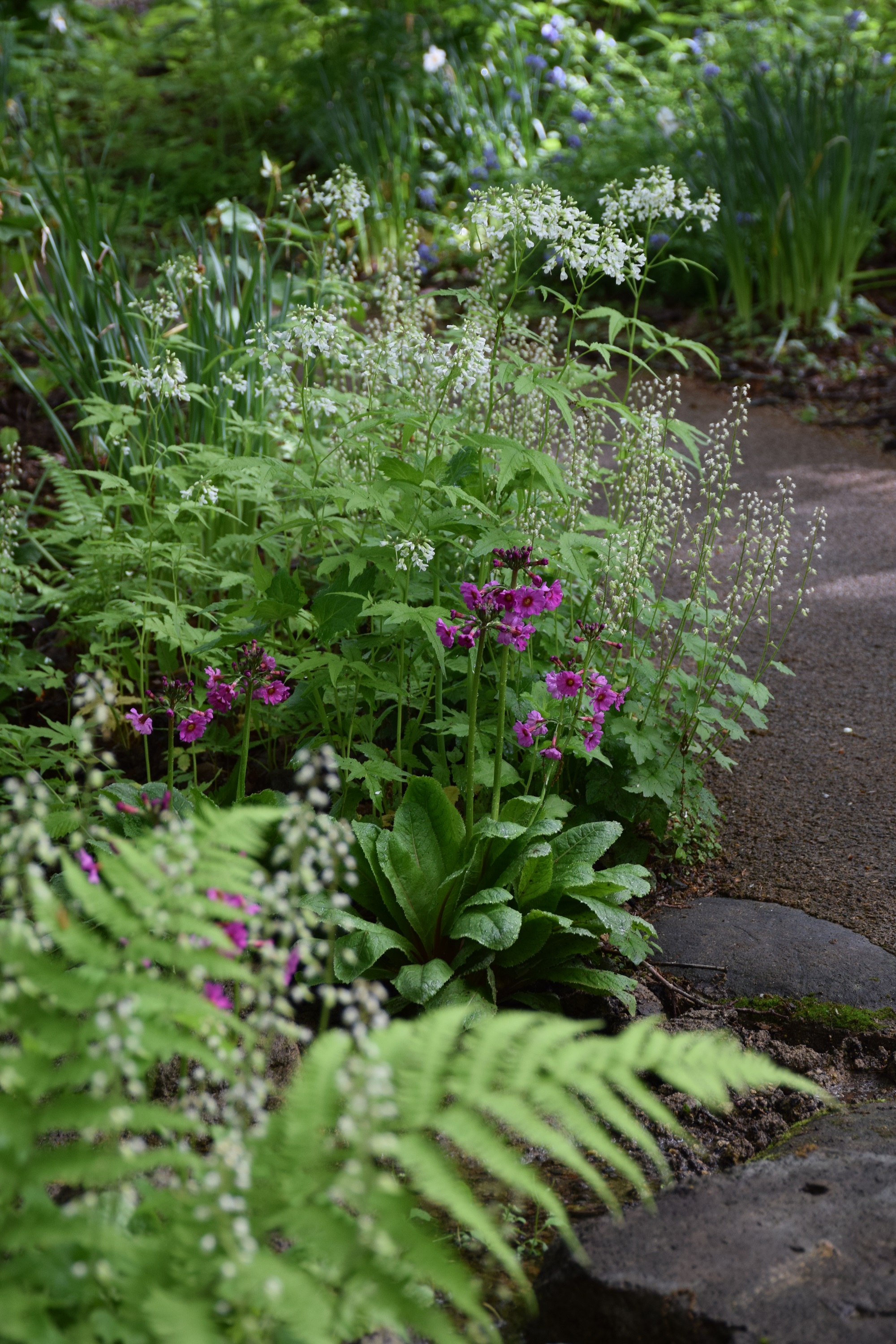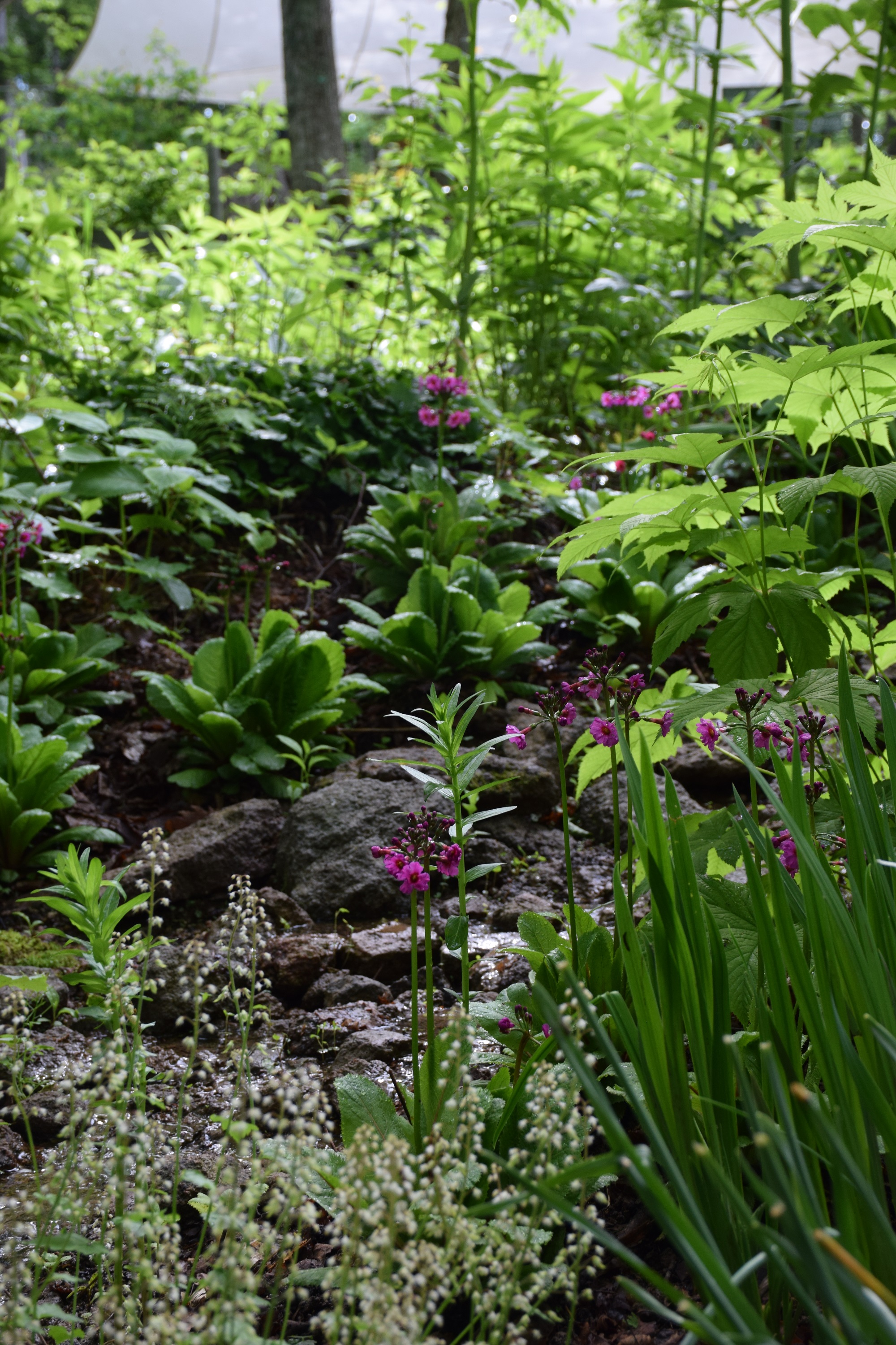 おすすめは、潤いの森です。新緑の美しさにピンクのサクラソウやクリンソウがよく映え、白いズダヤクシュも可憐な姿を見せてくれます。日陰が好きな少し控えめな植物たちが並ぶ細い道をゆっくり歩いてみてください。
