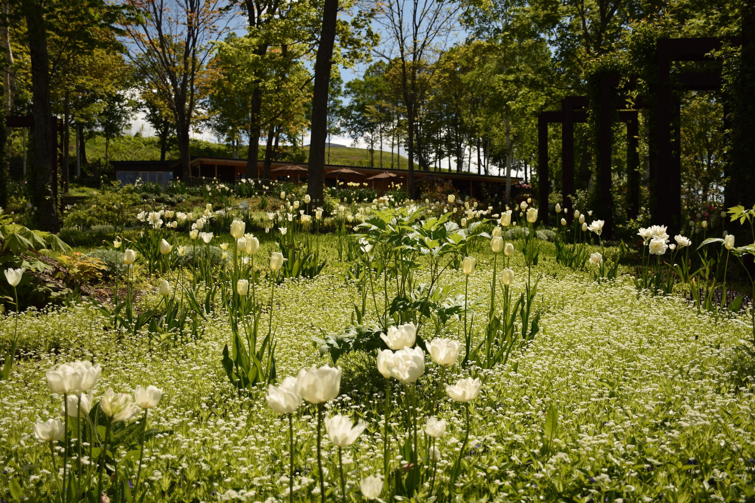 森の花園は、花の泉のグランドカバープランツが咲き揃い、まだ残る白いチューリップとクルマバソウがキラキラきれいです。