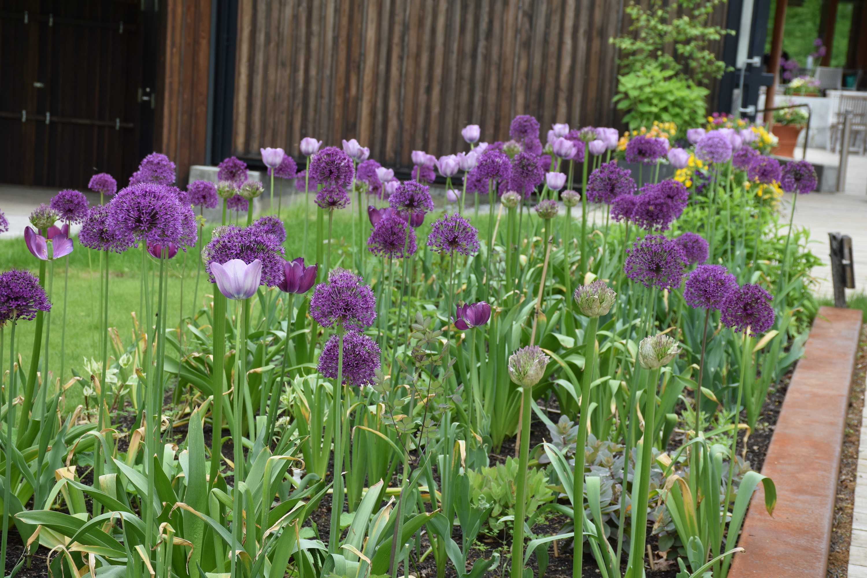 ガーデン入口にある「ファーガスと一緒に造った庭」ではアリウムと紫のチューリップがにぎやかにお客様をお出迎えしてくれました。この大きなアリウム‘グラブマスター’はとっても人気で、カメラをじっと構えている方がたくさんいました。