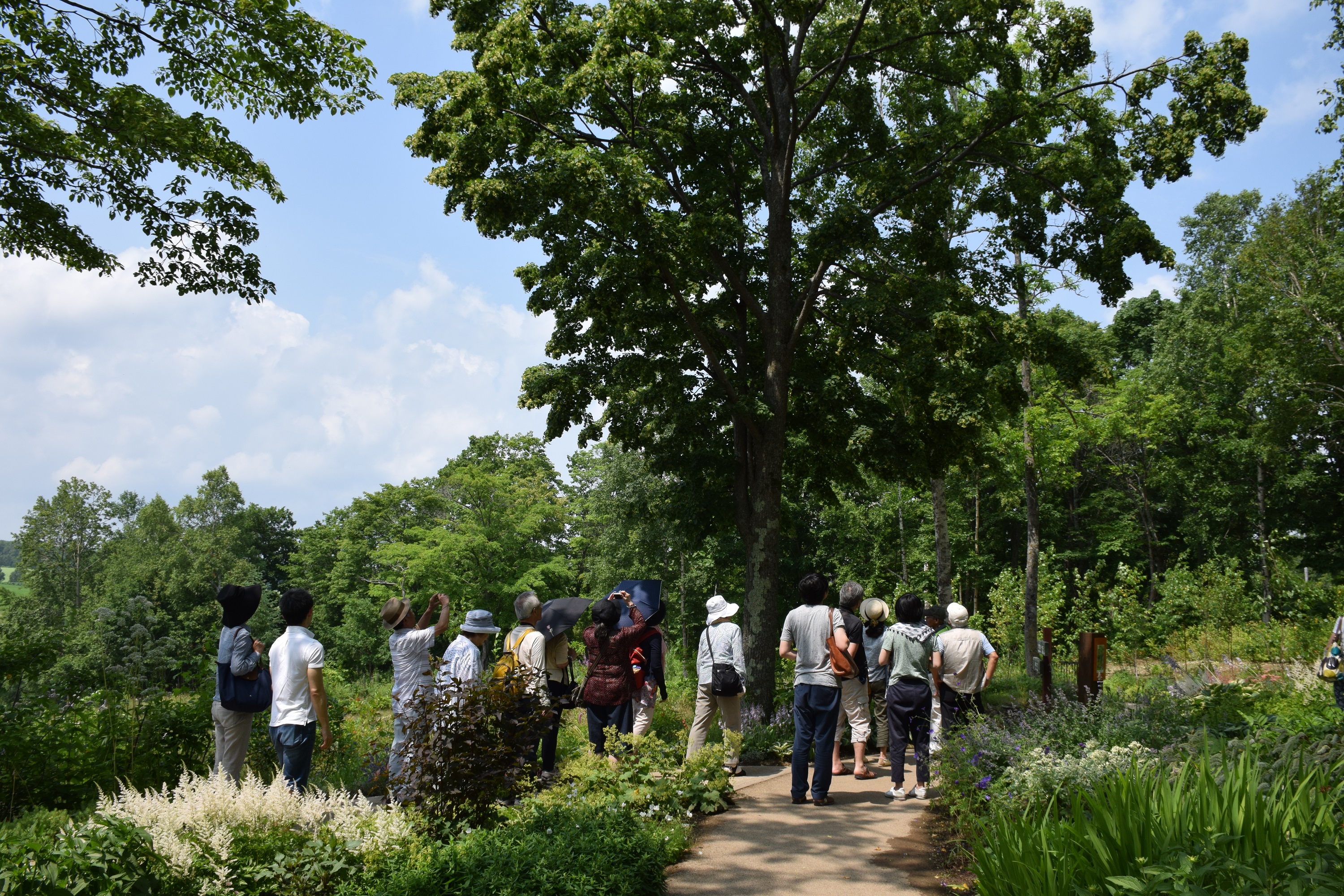 上の写真は、2年連続ボランティアガイドをしていただいているSさんが、ちょうどシナノキの花が満開のところを案内している所です。足元のお花ばかりではなく、自生の樹木がたくさんあるのが、当ガーデンの特徴の一つで、そんなところもしっかりご案内していただいています。