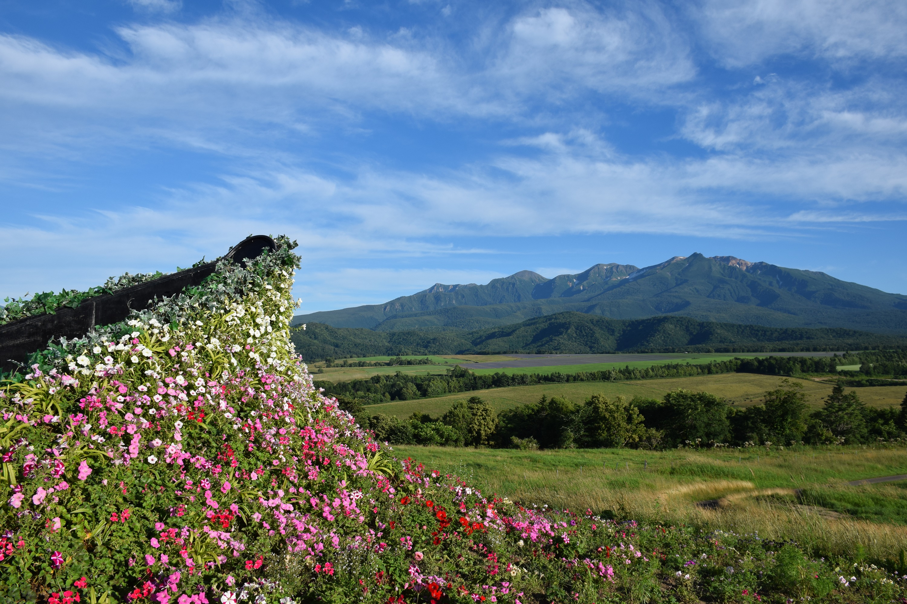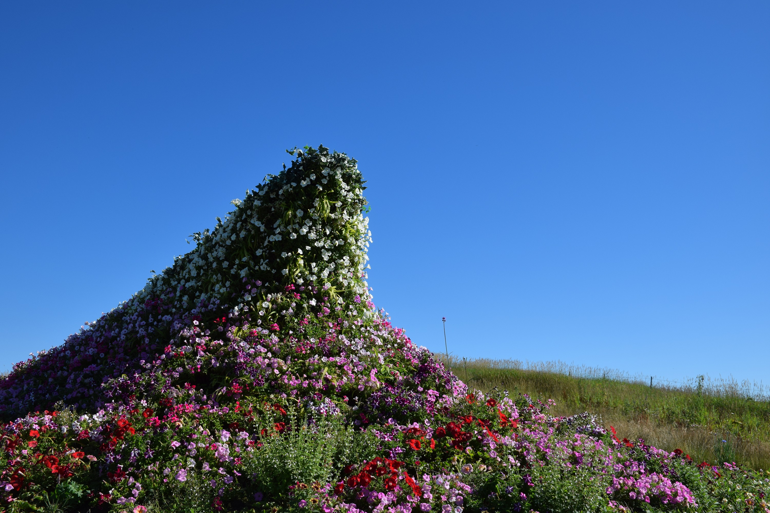 2016年のドレスガーデンはピンク系の色でした。こちらは8月上旬頃です。7月末に植え替えをして、ペチュニア、アイビーゼラニウムのドレスになりました。ここから見る大雪山連邦は手が届きそうなくらい近くに見えます。でも植物にとってはとても過酷な環境です。雨風に吹きさらしの為、連続台風ではかなりダメージを受けてしまいました。