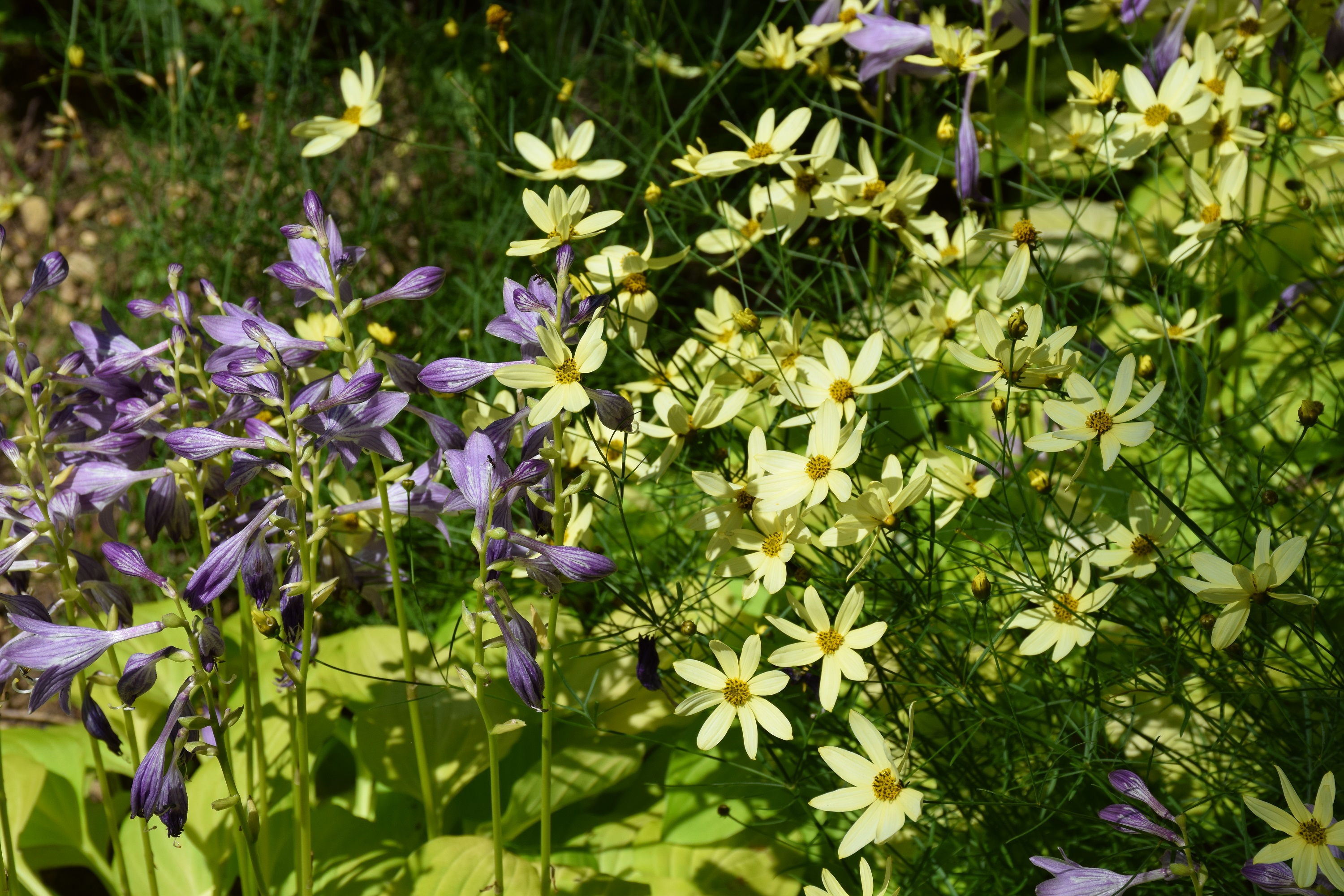 ホスタ‘リトルオーロラ’とコレオプシス‘ムーンビーム’との組み合わせが素敵でした。花と葉の色合わせもいろいろ楽しみながら、ご覧ください。
