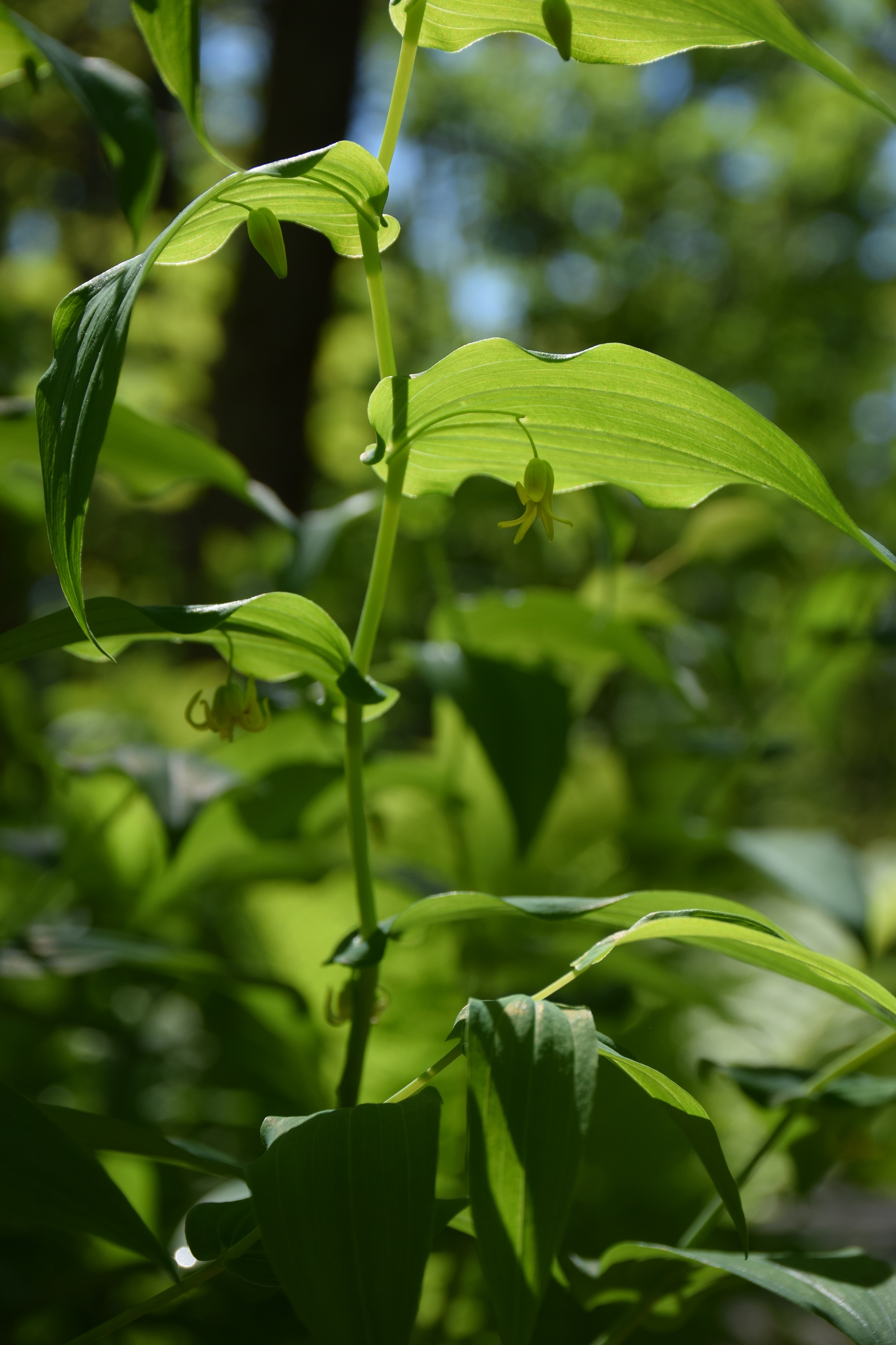 控えめというか、ほとんど気づかれないように葉の裏側にひっそりと咲いています。葉の付け根から伸びた花柄が、葉の裏側に沿って伸び、葉の中ほどでねじれ、下に折れ曲がって咲きます。一見、葉の真ん中に垂れ下がって咲いているように見えるのです。優しく触れて、ぜひ裏側にいる花も見てください。