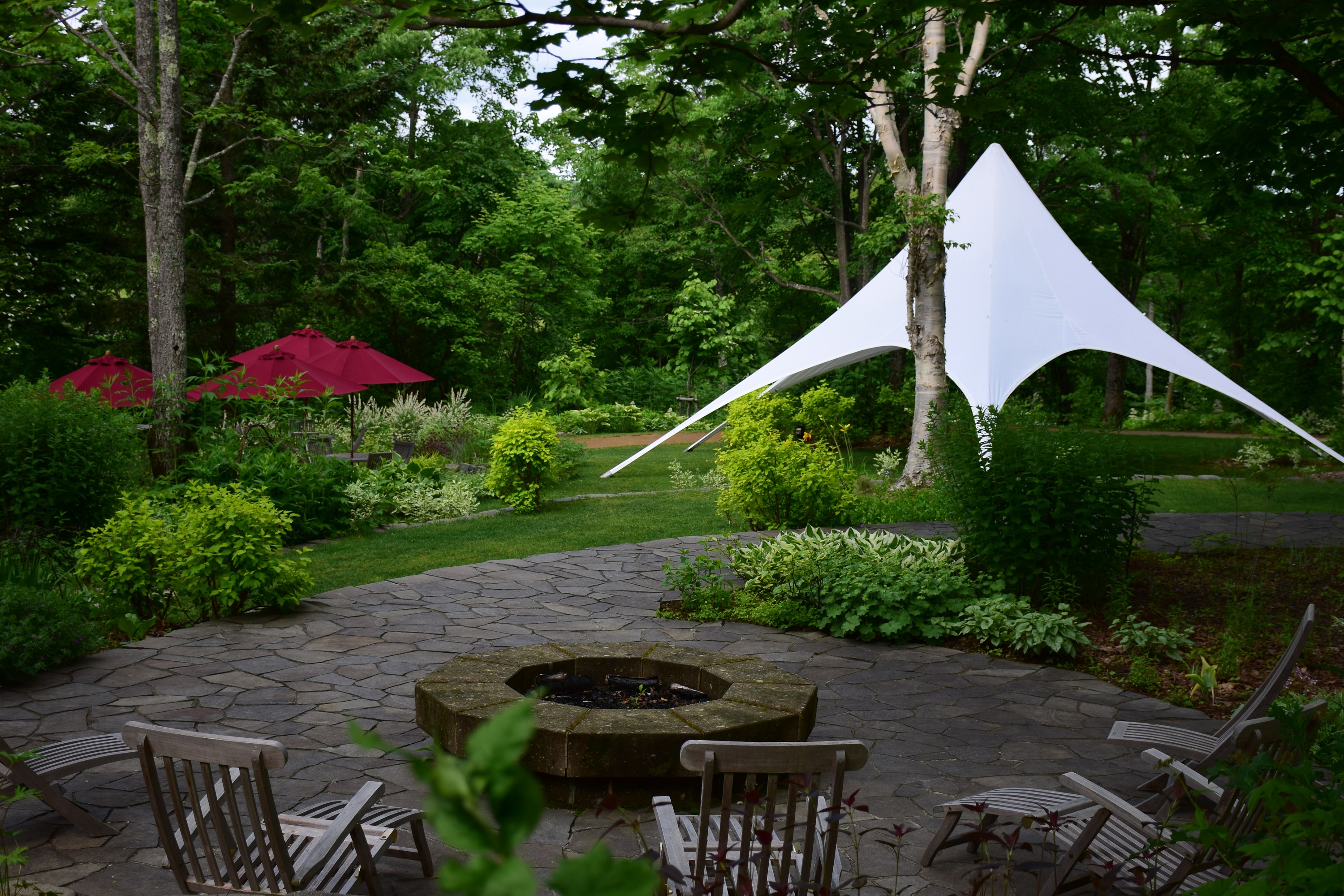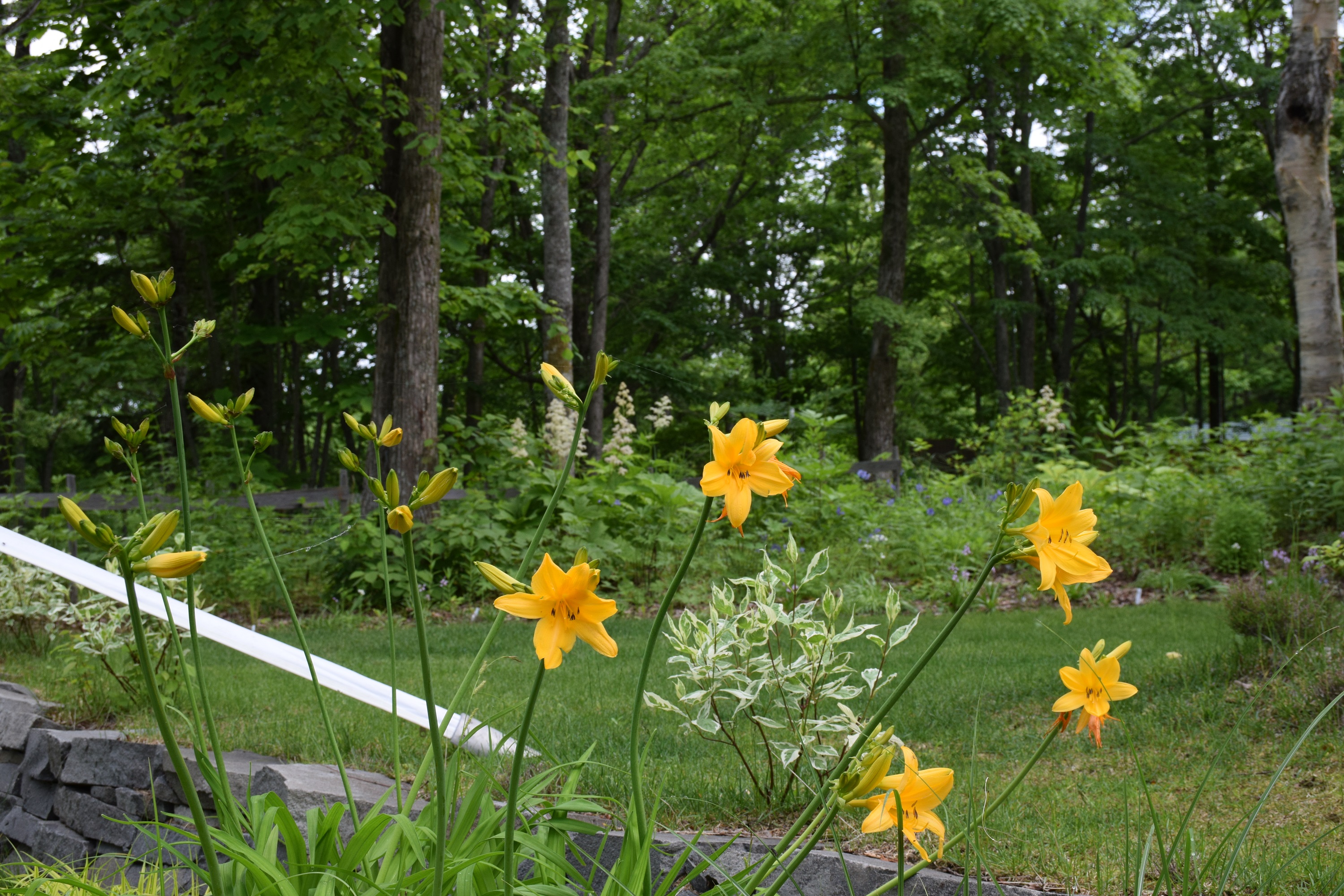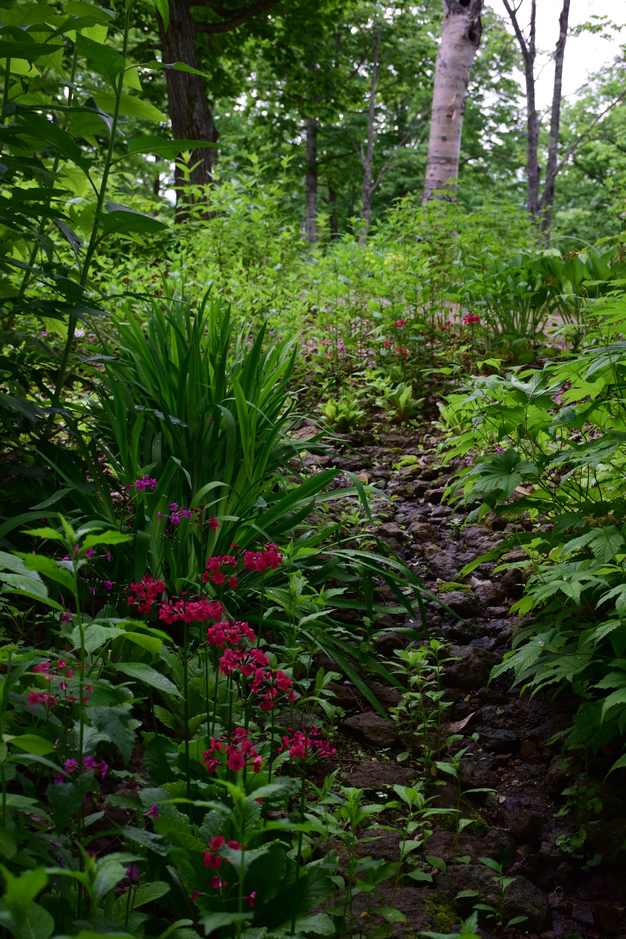 針葉樹の濃い緑、オヒョウの若緑色、トドマツには葉先が白くなっているミヤママタタビが絡まっており、ハクロニシキの白が混じった葉色も目を惹きます。手前のアメリカテマリシモツケ‘ルテウス’の黄色の葉やホスタの生き生きとした葉も素敵です。
