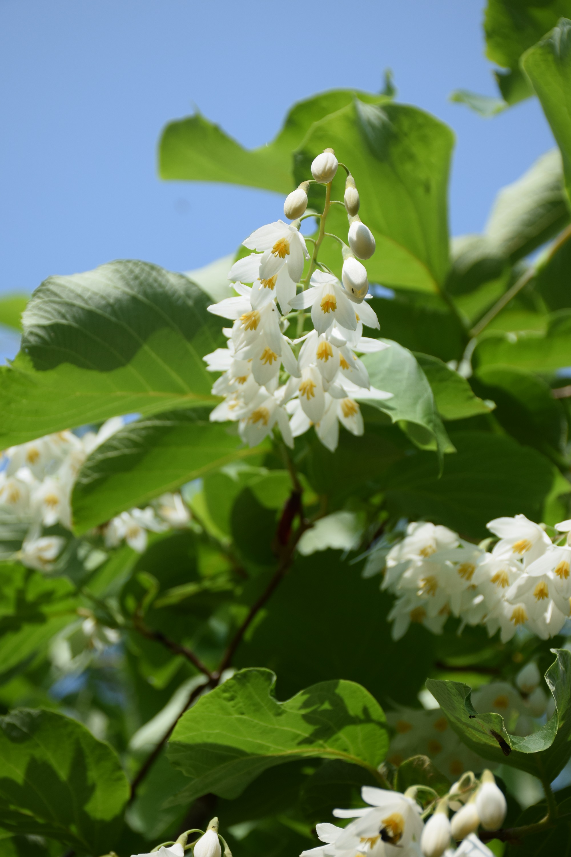 森の広場にあるハクウンボク(白雲木)。花の咲く様子が、白い雲を思わせるのでついた名前です。青空に映える白い雲のようにきれいな花がたくさん咲きました。高さ15mほどになる木ですが、ここではまだそれほど大きくなっていないので、間近で花を観察することができます。