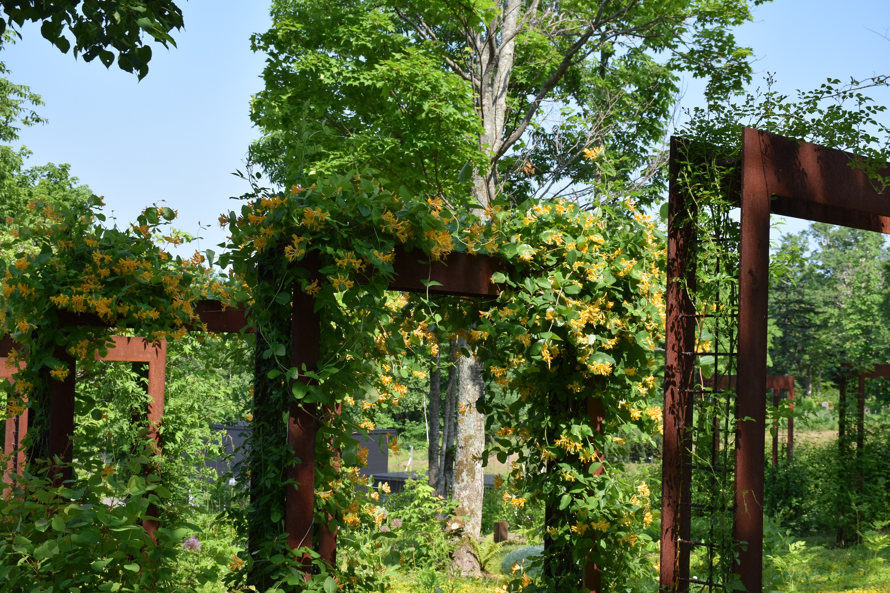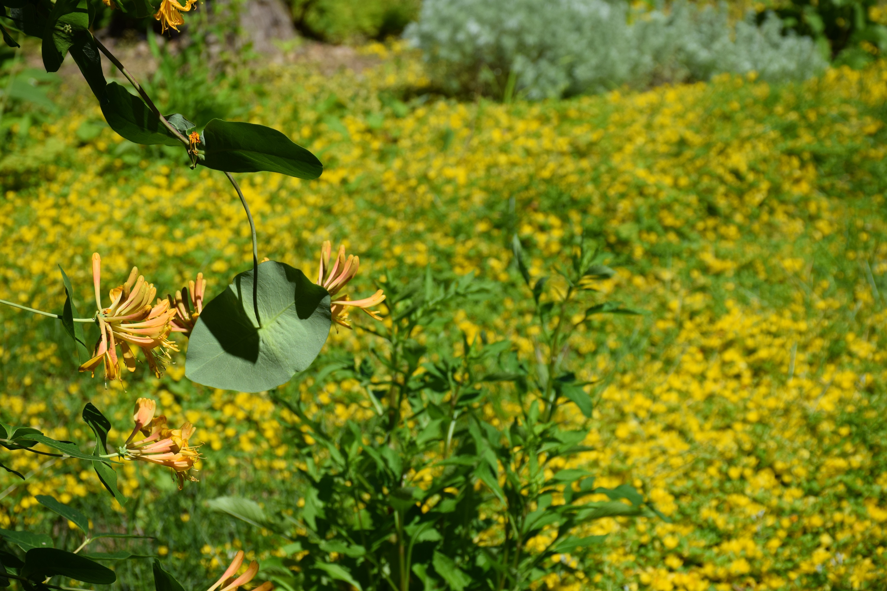 花の泉では、アーチに絡んだロニケラ・テルマニアーナの花がもりもり咲きます。足元もリシマキア・ヌンムラリアがびっしり、黄色の絨毯です。