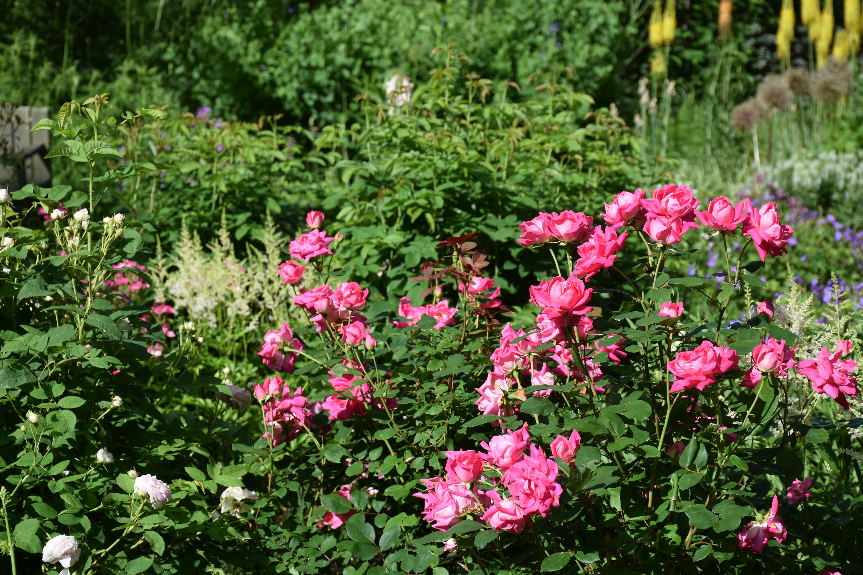 いろんなバラをまとめて植えているので、近くの園路を通ると、いい香りが漂ってきます。バラが咲くとやっぱり華やかなガーデンになります。