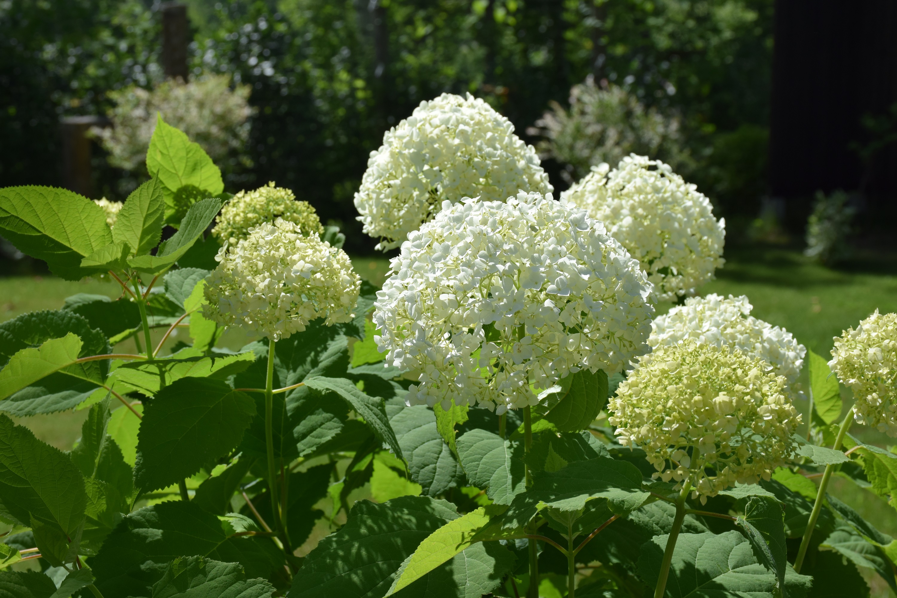 普通のアジサイと違って、当年枝開花性のため、森の花園のアナベルは秋には地際バッサリ切ってしまいます。そうすると、翌年はぐぐっと伸びた枝の先に大きな花を咲かせます。花が重たすぎて、支柱をしないと倒れてしまうこともありますが、人の顔の大きさ位になるため豪華で見ごたえがあります。
