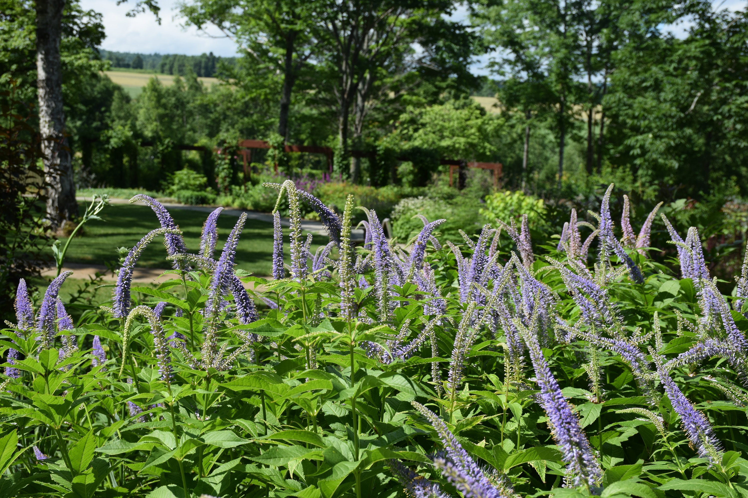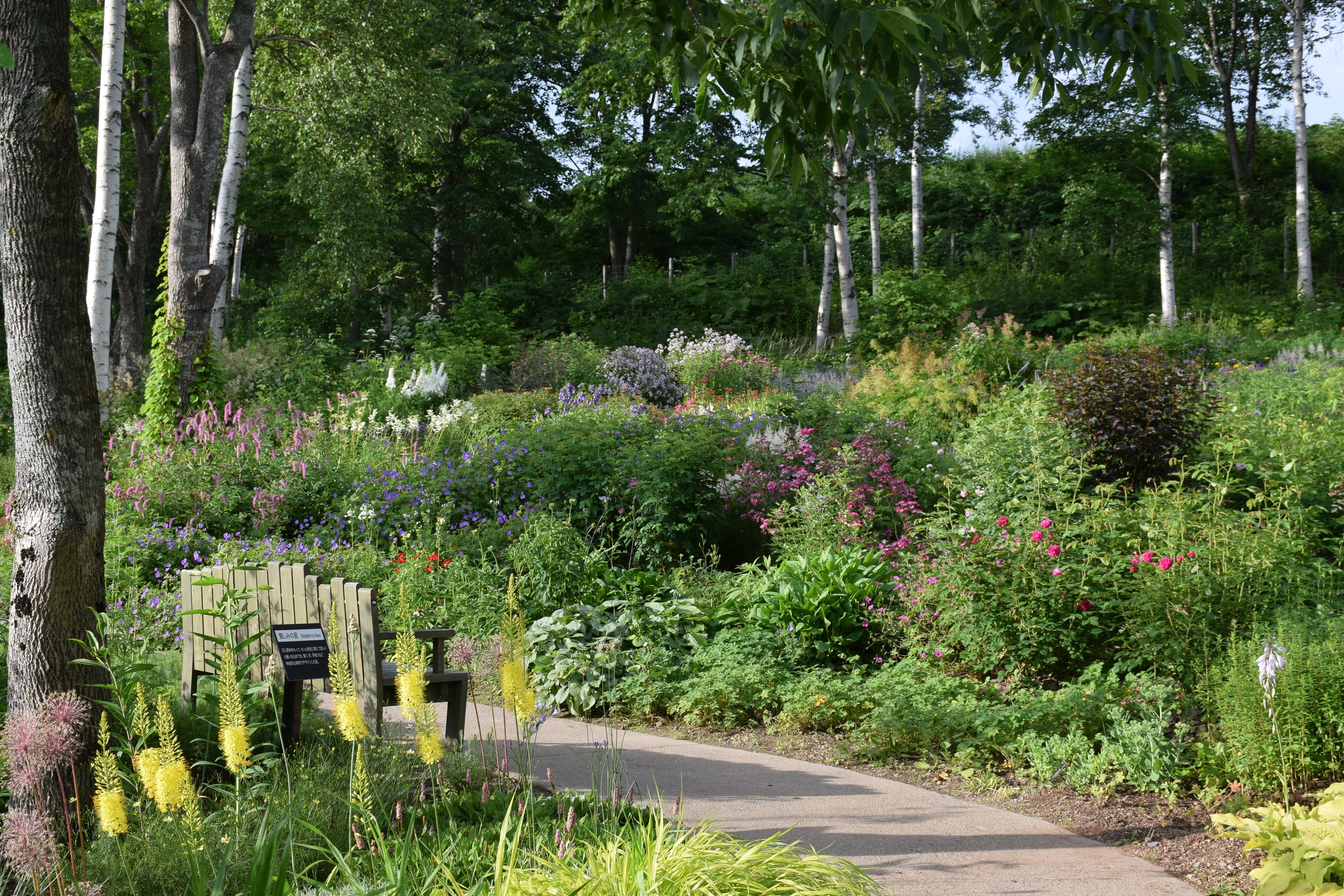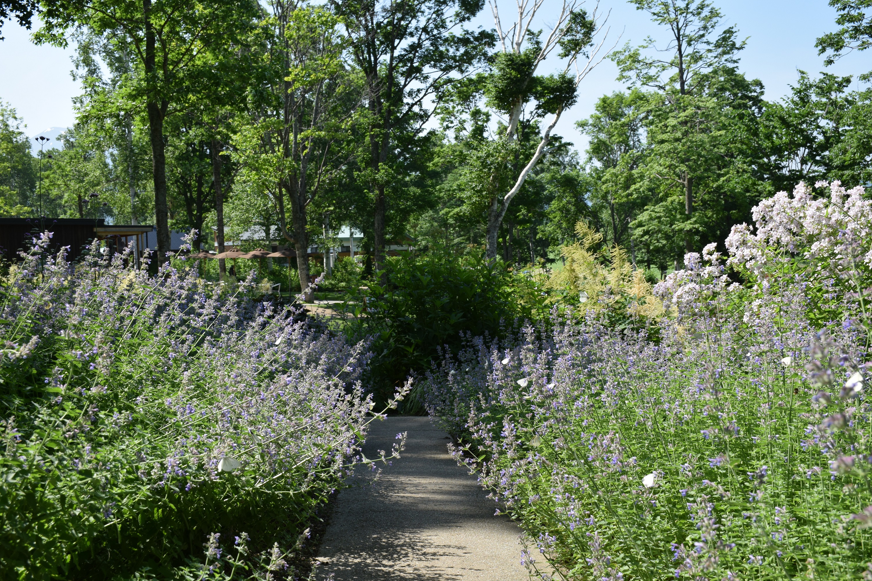 親しみの庭の手前、この位置からのこの景色もいいなぁと思います。奥に自然のシラカンバが見られるのもここのガーデンの特徴の一つなので、ぜひシラカンバとお花の写真を。